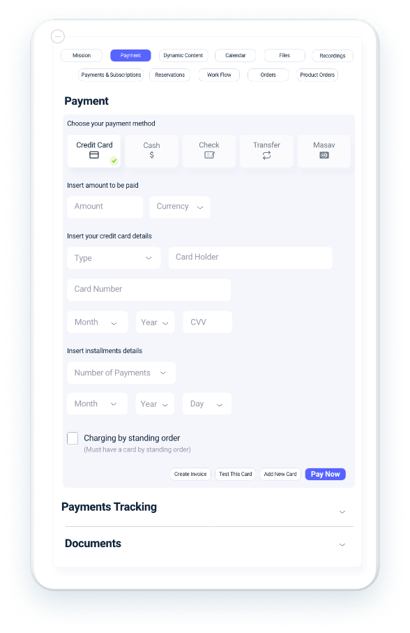 שכח משימוש במספר מערכות מקבילות בכדי להסדיר את התשלום מול הלקוחות שלך. המערכת החכמה שלנו מאפשרת פתרון מאובטח ברמה הגבוהה ביותר בו יכול הלקוח לבצע את כל התשלומים, אם זה באמצעות כרטיס אשראי או הוראת קבע בנקאית, ולך לנהל מעקב חי על כל התשלומים, כולל חשבוניות, קבלות ועד ולאחסן הכל במקומות המתאימים.