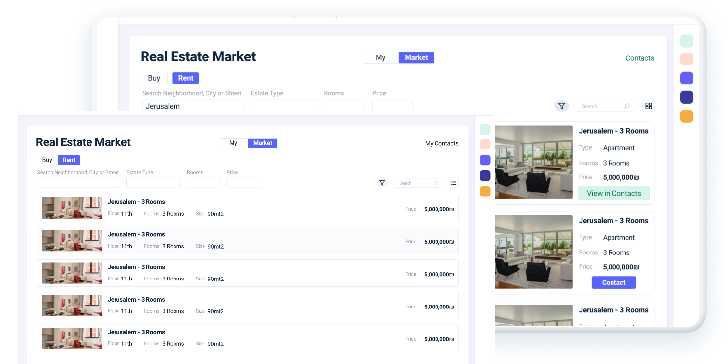 תתחבר לשוק הנדל"ן הכללי שלנו ובו לראות את מגוון הנכסים הקיים במערכת הכללית. תוכל לבחון ולתקשר עם סוחרים נוספים, לבצע ניתור וזיהוי אוטומטי של נכסים דומים במאגר על פי הקריטריונים שבחרת ועוד והכל מאותו המקום. הכנסת נכס חדש למכירה? מעולה, המערכת החכמה תדע לזהות אוטומטית קונים אופציונאליים המתאימים למפרט הנכס החדש ולהציג לך אותם באופן מסודר וברור.